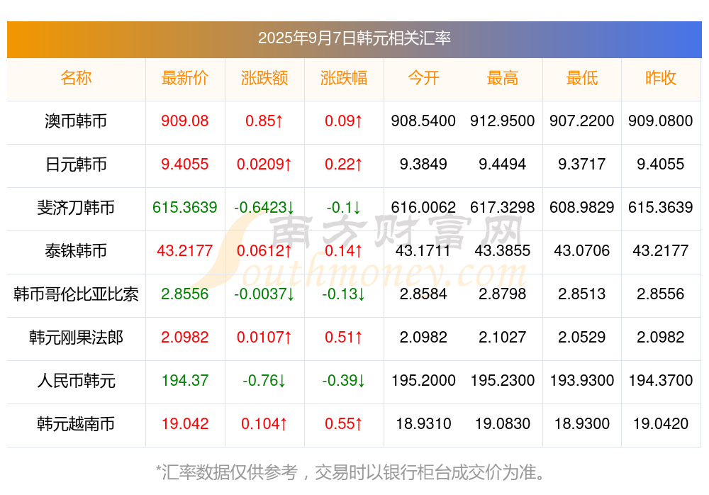 根據(jù)2025年9月7日匯率,韓元兌換越南幣匯率最新19.042000,今開18.9310,昨收19.0420,最高19.0830,最低18.9300。