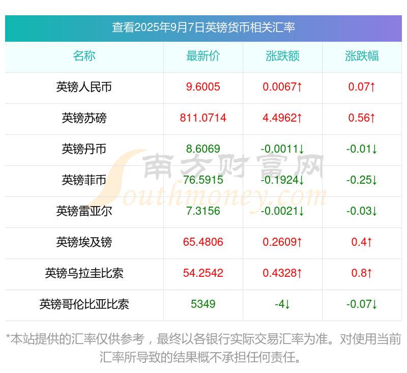 2025年9月7日英鎊相關匯率查詢