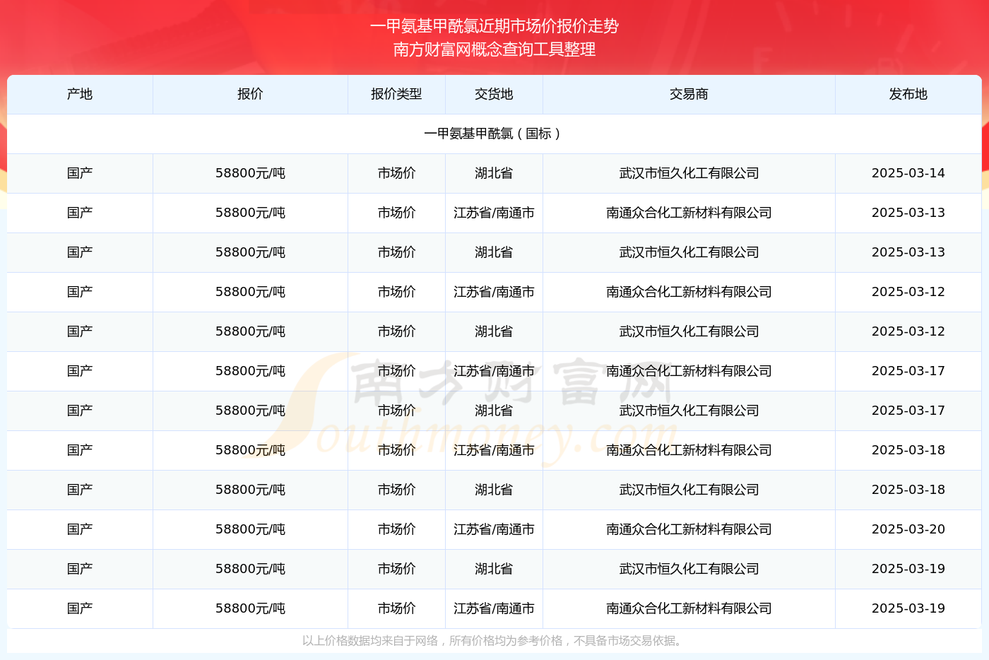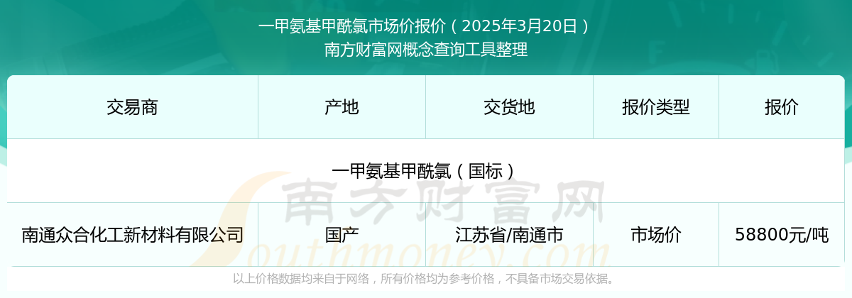 2025年3月20日,南通眾合化工新材料有限公司一甲氨基甲酰氯(國標),國產,交易地點為江蘇省/南通市,市場價報價為58800.00元/噸。