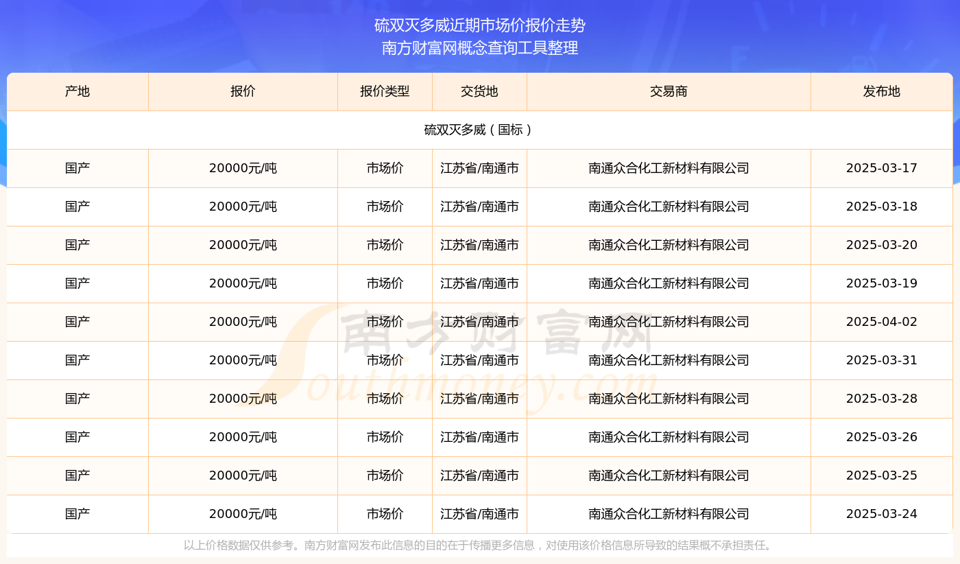 2025年4月2日,南通眾合化工新材料有限公司硫雙滅多威(國標),國產(chǎn),交易地點為江蘇省/南通市,市場價報價為20000.00元/噸。