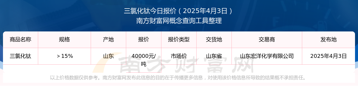 2025年4月3日,三氯化钛(>15%)市场价价格为40000.00元/吨,报价人:山东宏洋化学有限公司,交易地点为山东省。