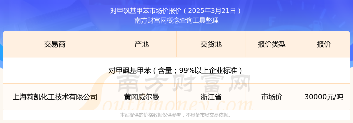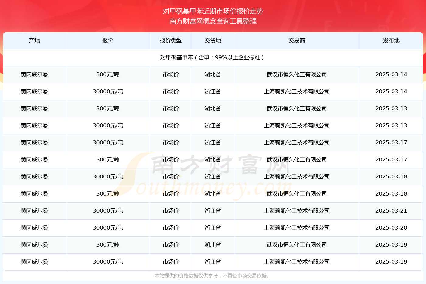 2025年3月21日對(duì)甲砜基甲苯市場(chǎng)價(jià)報(bào)價(jià)詳情及近期市場(chǎng)價(jià)報(bào)價(jià)走勢(shì)