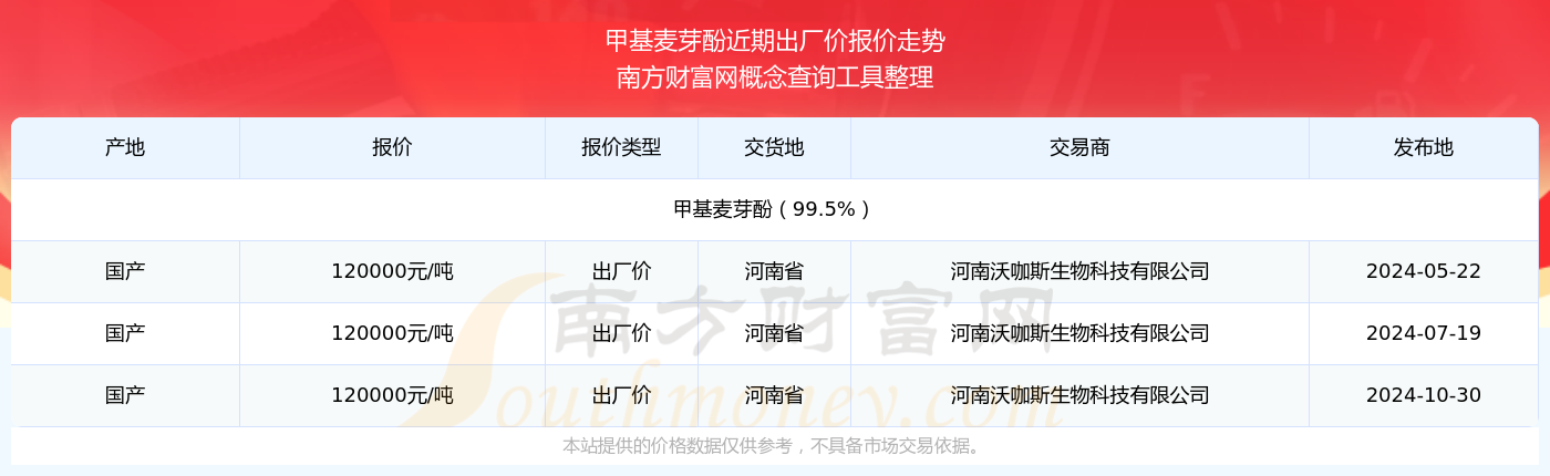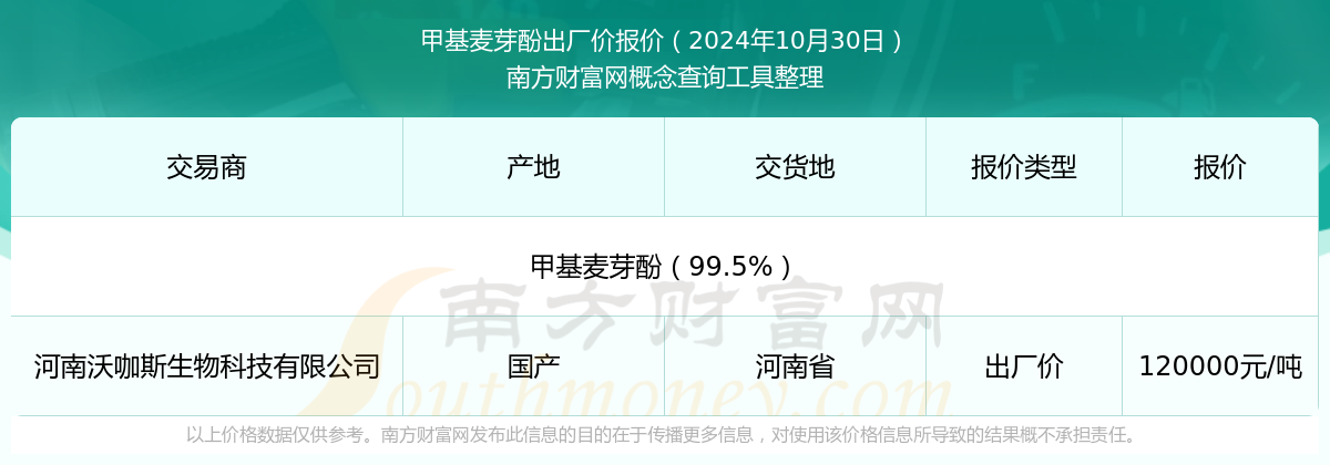 2024年10月30日,河南沃咖斯生物科技有限公司甲基麥芽酚(99.5%),國產(chǎn),交易地點為河南省,出廠價報價為120000.00元/噸。