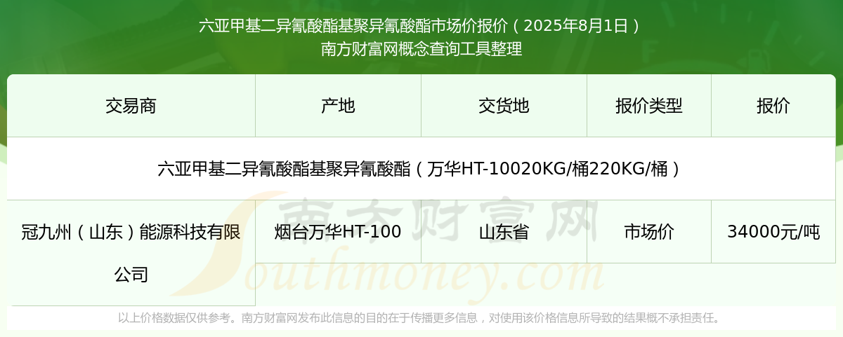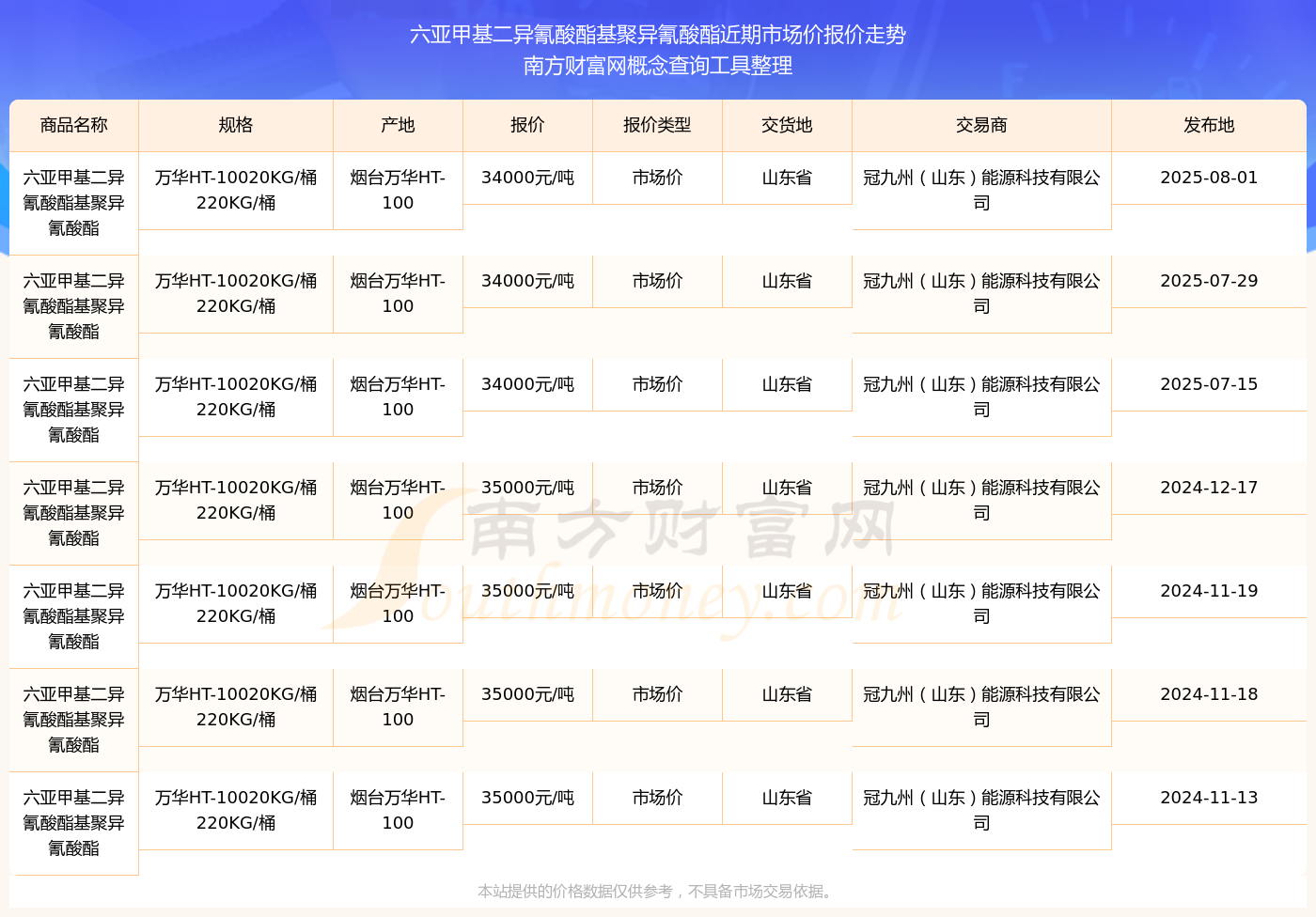 2025年8月1日,冠九州(山東)能源科技有限公司六亞甲基二異氰酸酯基聚異氰酸酯(萬華HT-10020KG/桶220KG/桶),煙臺萬華HT-100,交易地點為山東省,市場價報價為34000.00元/噸。