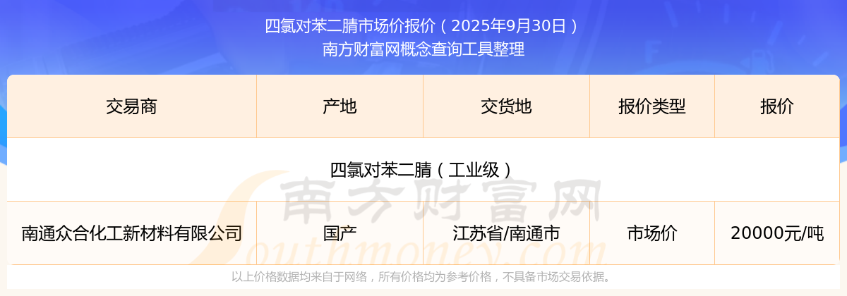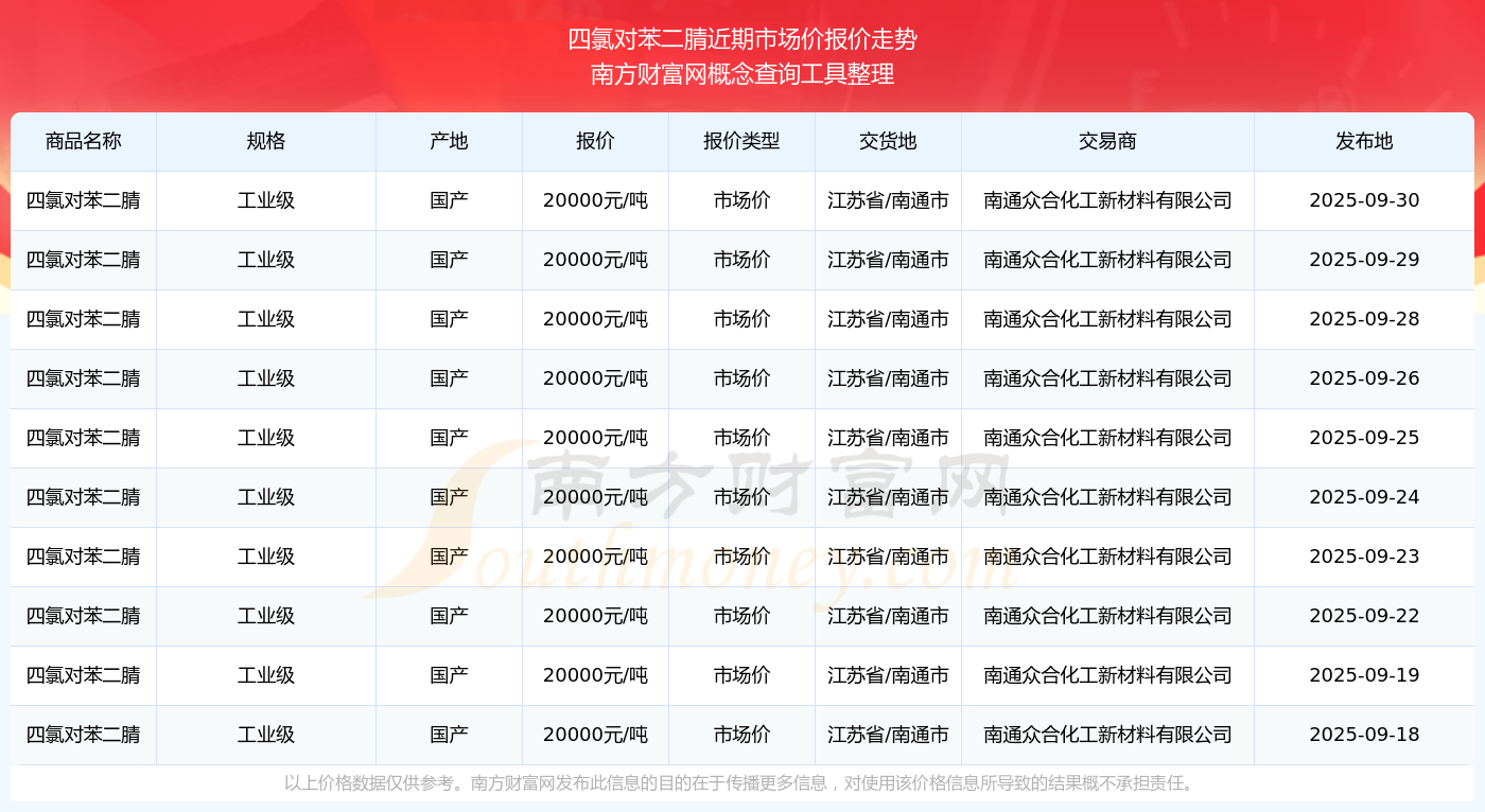 2025年9月30日,四氯對苯二腈(工業(yè)級)市場價價格為20000.00元/噸,報價人:南通眾合化工新材料有限公司,交易地點為江蘇省/南通市。
