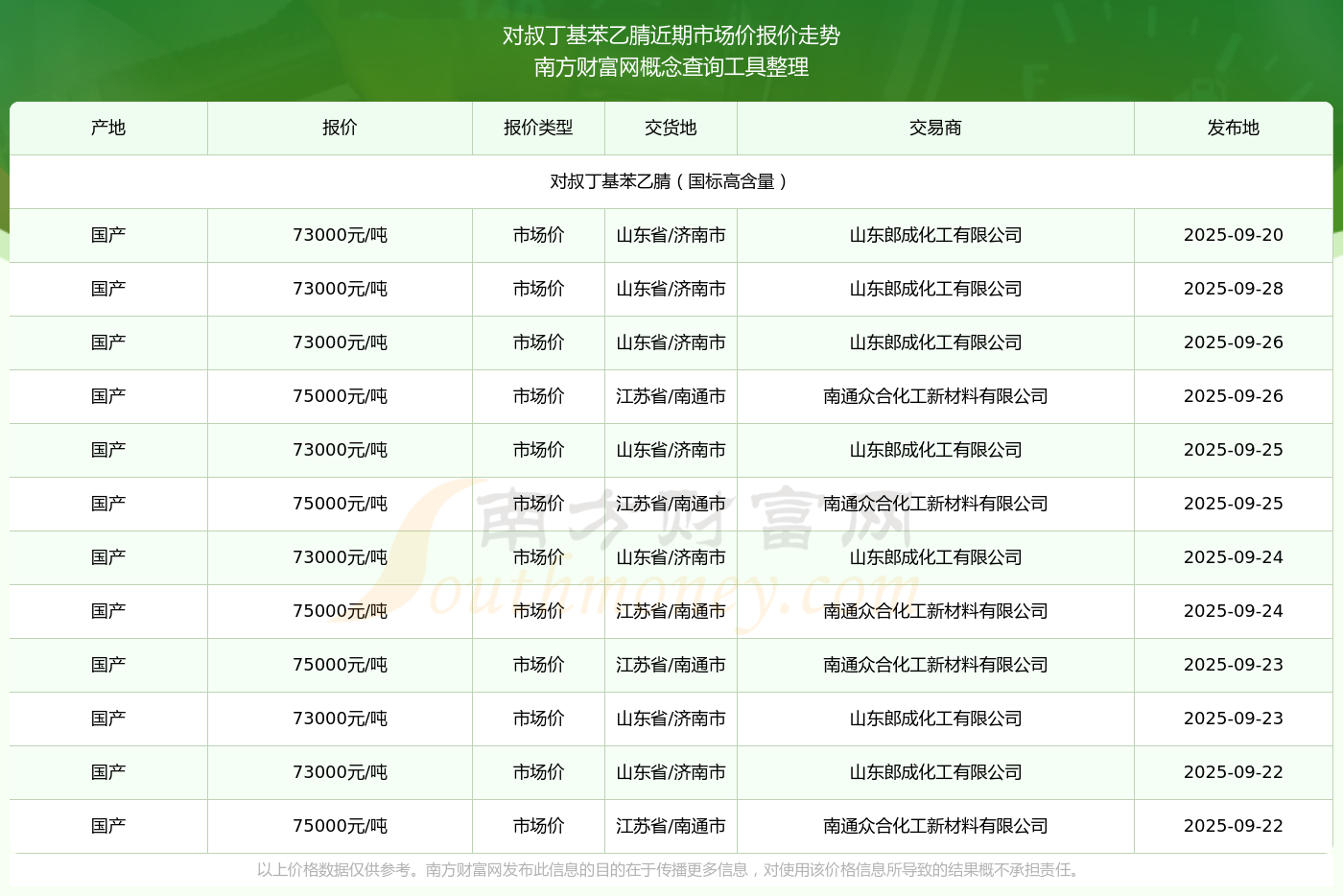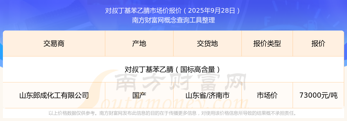 2025年9月28日,對叔丁基苯乙腈(國標高含量)市場價價格為73000.00元/噸,報價人:山東郎成化工有限公司,交易地點為山東省/濟南市。