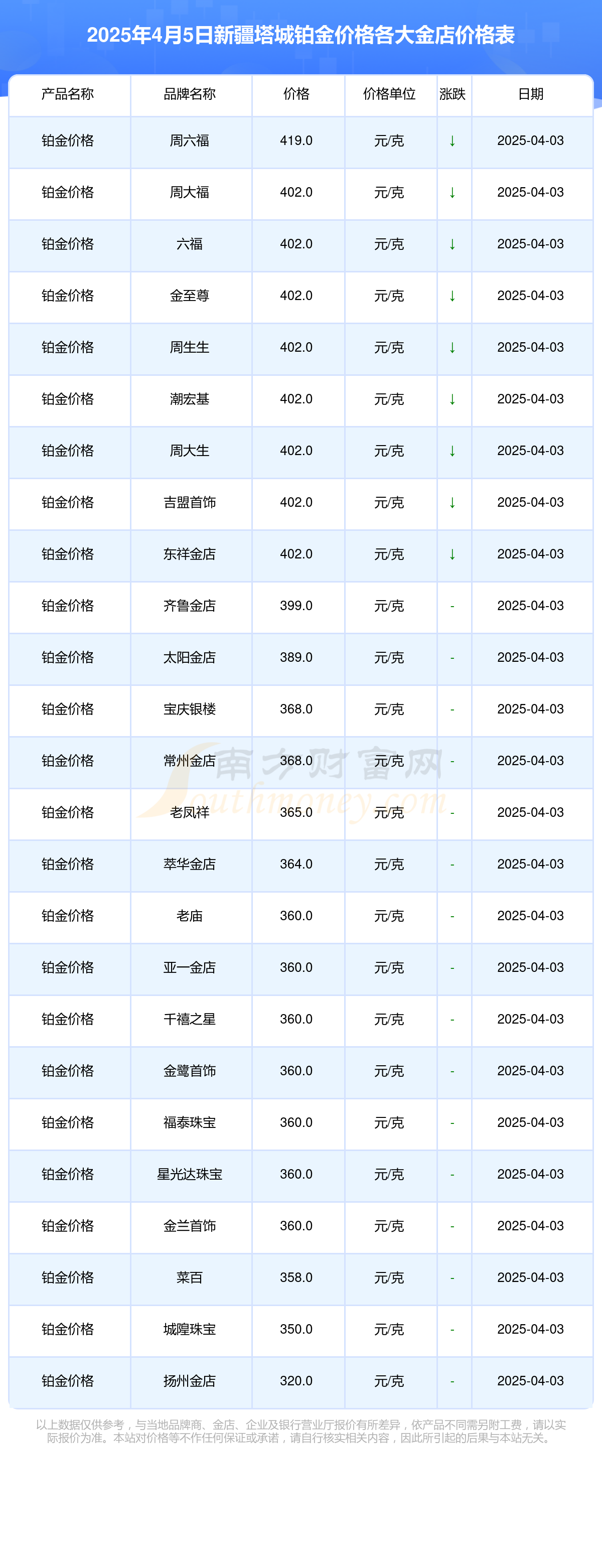 新疆塔城各大金店铂金价格查询(2025年4月5日)